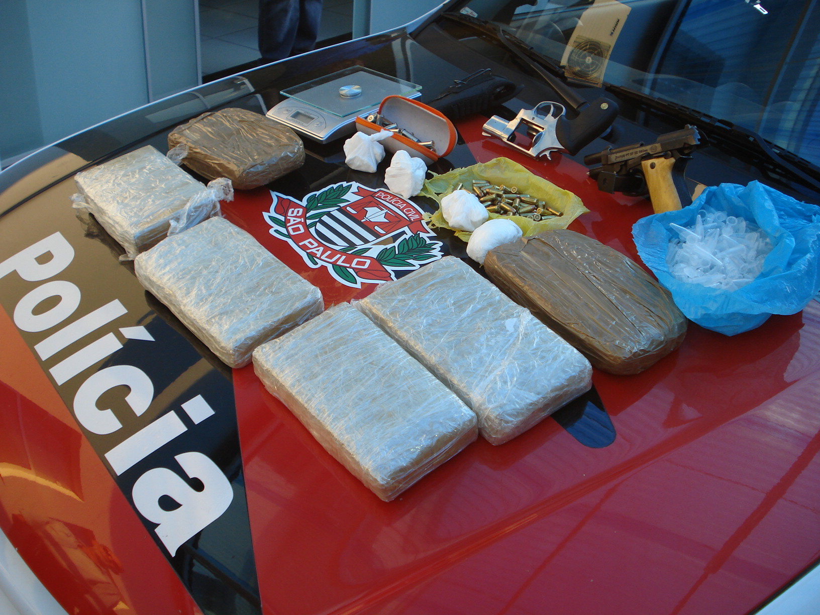 Na casa de E. G., de 31 anos, os policiais civis encontraram 2, 2 quilos de maconha, 3, 1 quilos de cocaína, um revolver 38 e uma pistola 765.