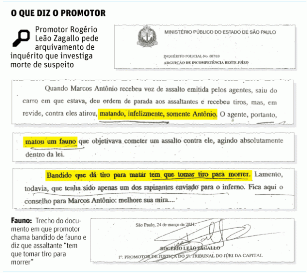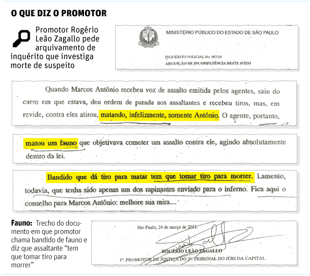 “O agente matou um fauno que objetivava cometer assalto contra ele, agindo absolutamente dentro da lei”, escreveu o promotor em sua manifestação, comparando o suspeito morto no episódio ao ser da mitologia romana meio homem meio animal.