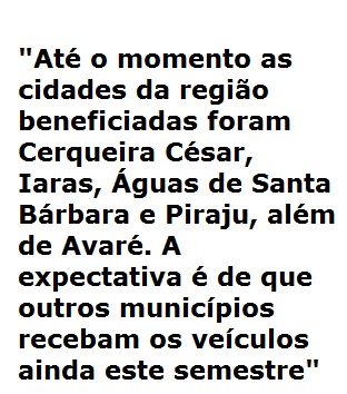 Para as Ciretrans foram adquiridos veículos Chevrolet, modelo Prisma e motocicletas Kasinski, modelo Comet, de 150 cilindradas, todos devidamente identificados com o logotipo do Detran. Até o momento as cidades da região beneficiadas foram Cerqueira César, Iaras, Águas de Santa Bárbara e Piraju, além de Avaré. A expectativa é de que outros municípios recebam os veículos ainda este semestre.