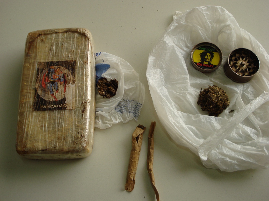 Após, os policiais realizaram buscas no quintal da casa, onde foi localizada, sob uma pilha de tijolos, uma sacola plástica contendo uma substância amarelada, com cor e característica de cocaína e uma porção de maconha. Em seu quarto, os policiais encontraram sob o computador, um dichavador e mais uma porção de maconha. Caio assumiu a propriedade das drogas, sendo lhe dada voz de prisão em fragrante.