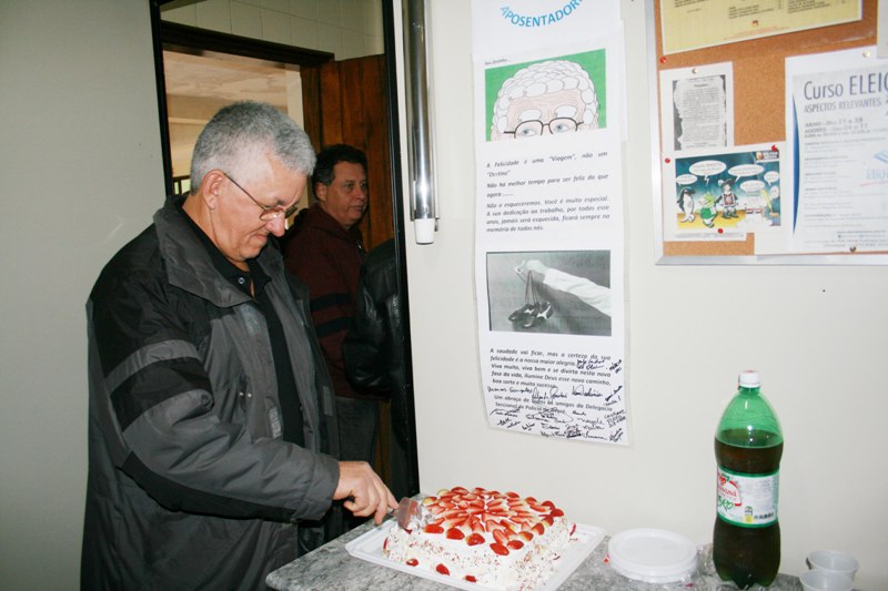 A fim de homenageá-lo por todo o trabalho na Polícia Civil, realizado sempre de forma dedicada, a Delegacia Seccional fez uma festa surpresa na segunda-feira, dia 16, com direito a bolo, salgadinho, refrigerante e presente. A iniciativa contou com a participação de todos os funcionários, que se cotizaram para promover a merecida homenagem.
