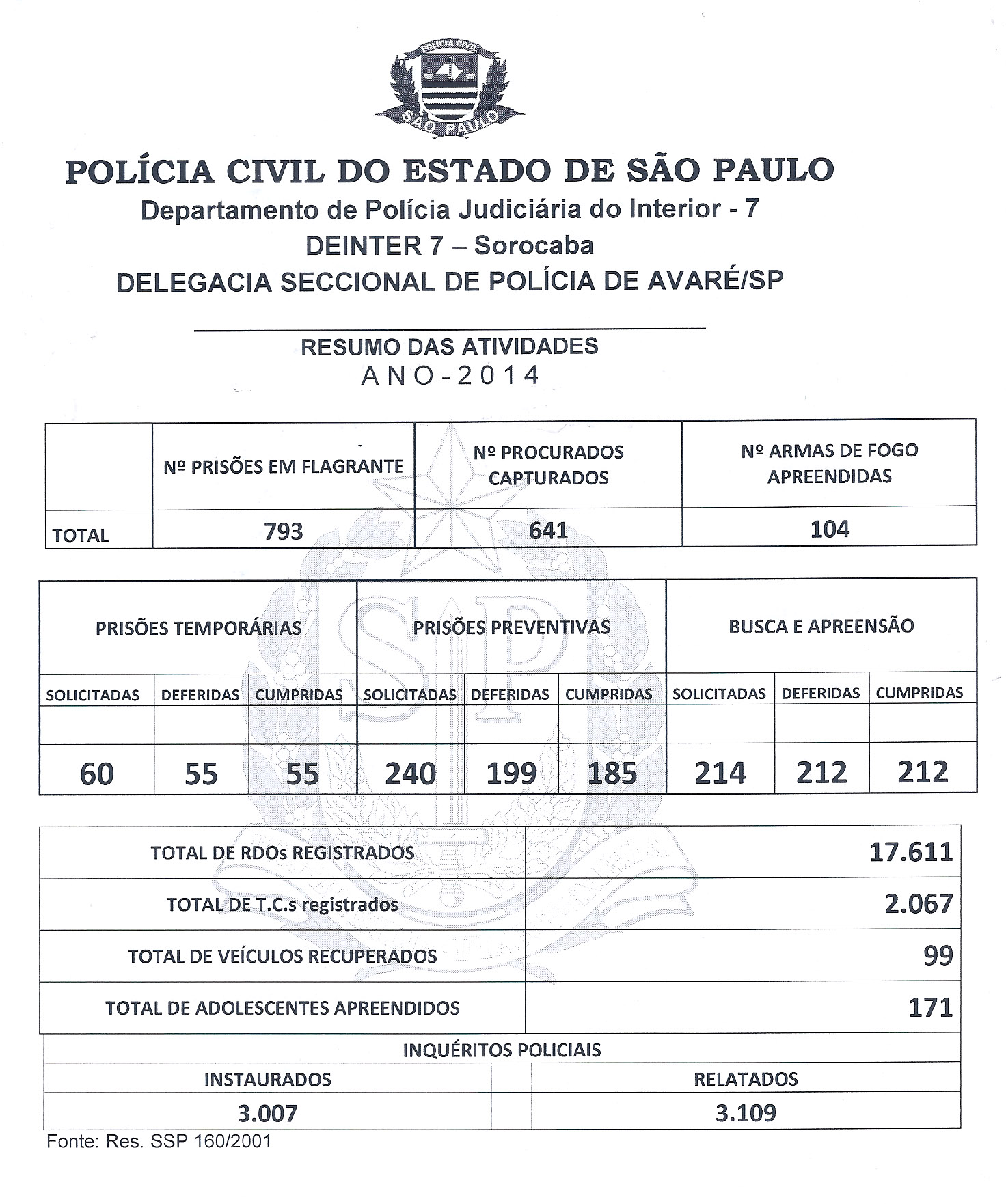 Em 2014 foram efetuadas 1434 prisões; 104 armas de fogo apreendida;