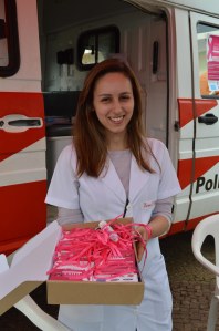 Uma viatura da Polícia Civil permaneceu no local e atraiu os pedestres para receber informações sobre a campanha, buscando estimular a detecção precoce do câncer de mama, que é a segunda causa de morte entre mulheres no mundo.