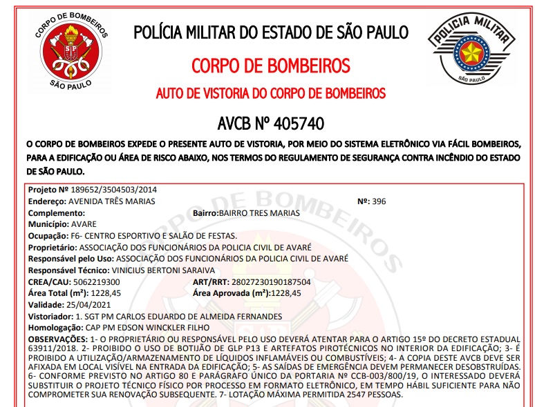 A diretoria da Associação dos Funcionários da Polícia Civil de Avaré, recebeu do Corpo de Bombeiros de Avaré a renovação do Auto de Vistoria do Corpo de Bombeiros – AVCB. Também atualizou seu Alvará de Funcionamento Municipal, documento igualmente importante para seu funcionamento com instituição.