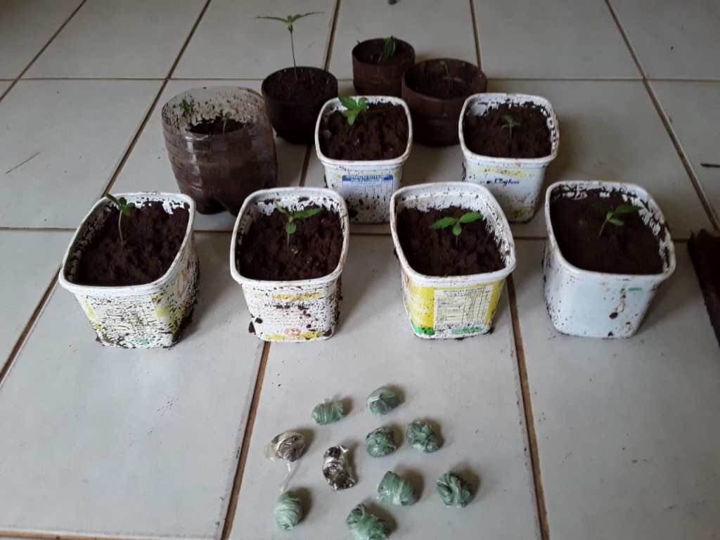 As plantas – 12 no total – estavam em potes de plástico encontrados no quintal da casa. Além da erva em natura, os policiais também encontraram no mesmo local, 10 porções processadas da droga, prontas para venda.