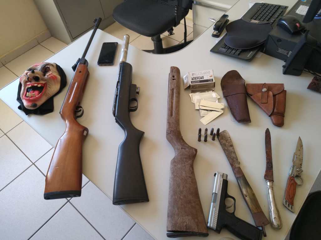Durante a ação foram apreendidos uma carabina semiautomática de calibre nominal 22, equipada com silenciador, um simulacro de pistola, uma espingarda de pressão, sete munições de calibre 38, munições de air soft, uma máscara, além de três facas, 18 lâminas de bisturi e os telefones celulares dos menores.