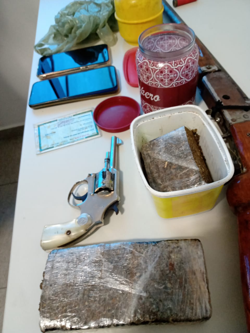 Ainda segundo a Polícia Civil, no quarto do suspeito havia um revólver calibre 22 e uma espingarda cartucheira de fabricação caseira, bem como algumas munições. Um pequeno valor em dinheiro também foi localizado. A quantia, as substâncias entorpecentes, as armas, munições e o veículo foram apreendidos e encaminhados à Delegacia.