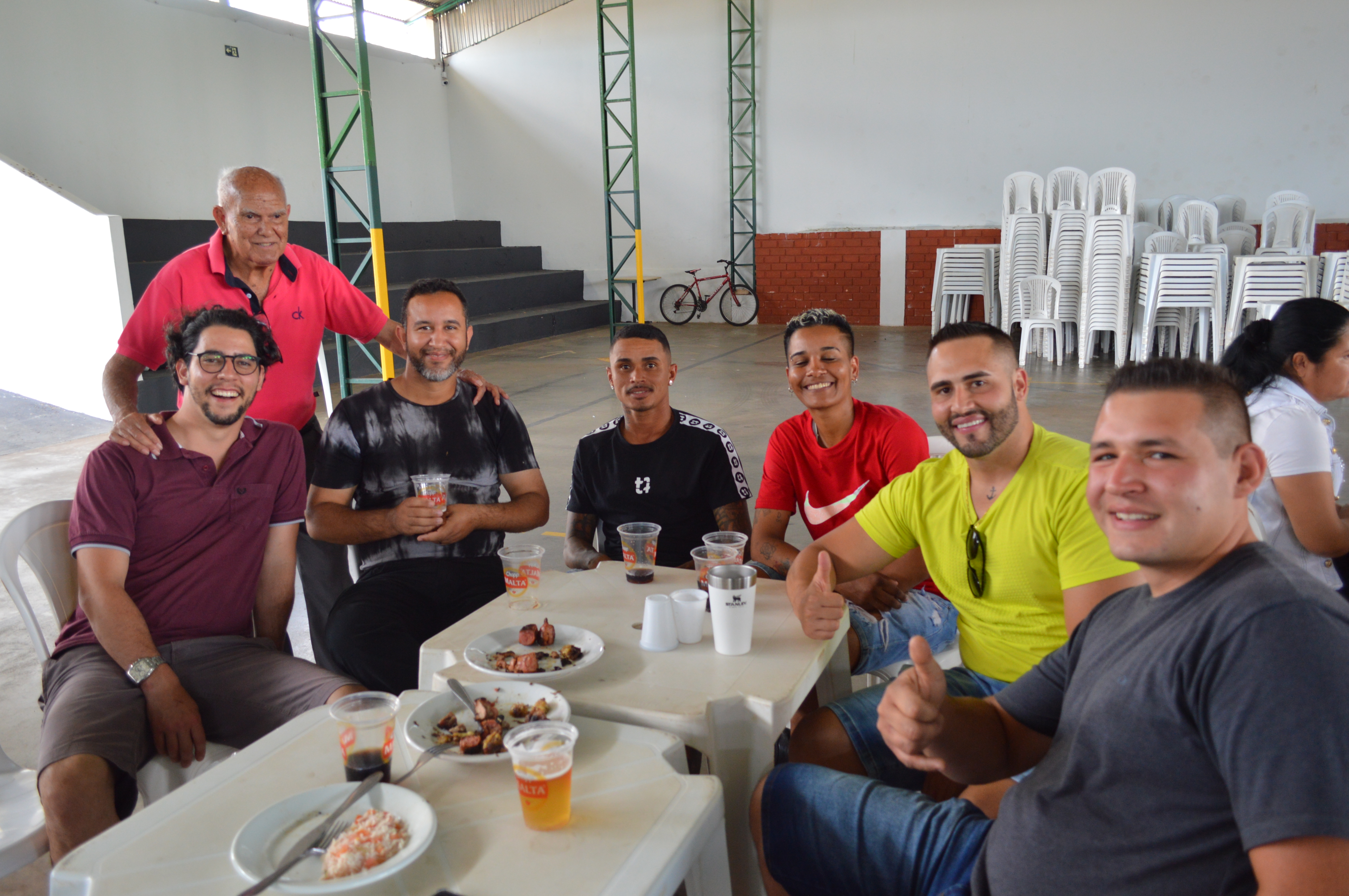 Foi servido neste almoço de confraternização um churrasco completo com linguiça e carne assada, farofa, vinagrete, arroz branco, pão, refrigerante a vontade e aos mais velhos um barril de chopp Malta.