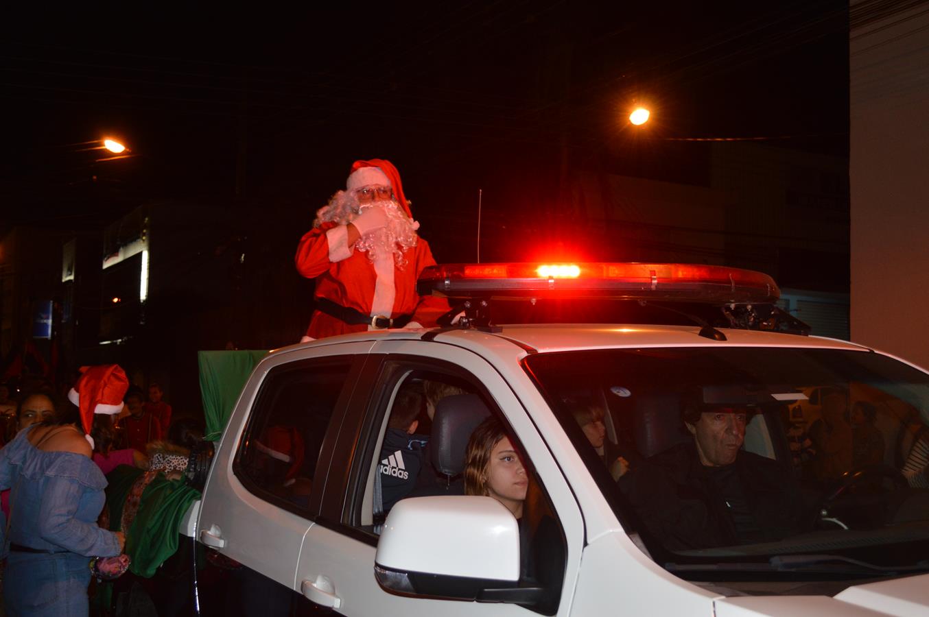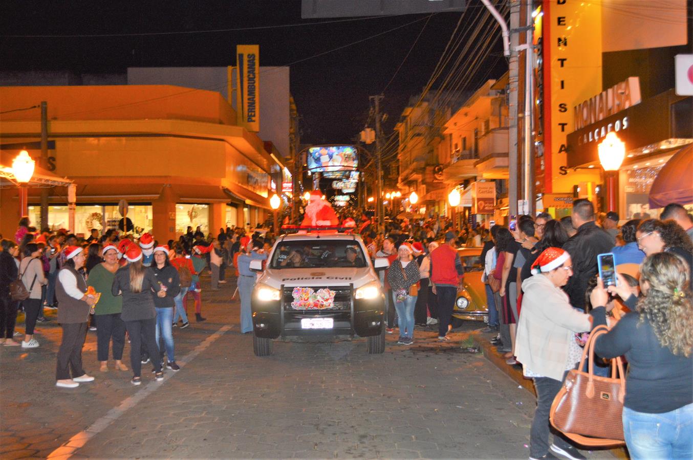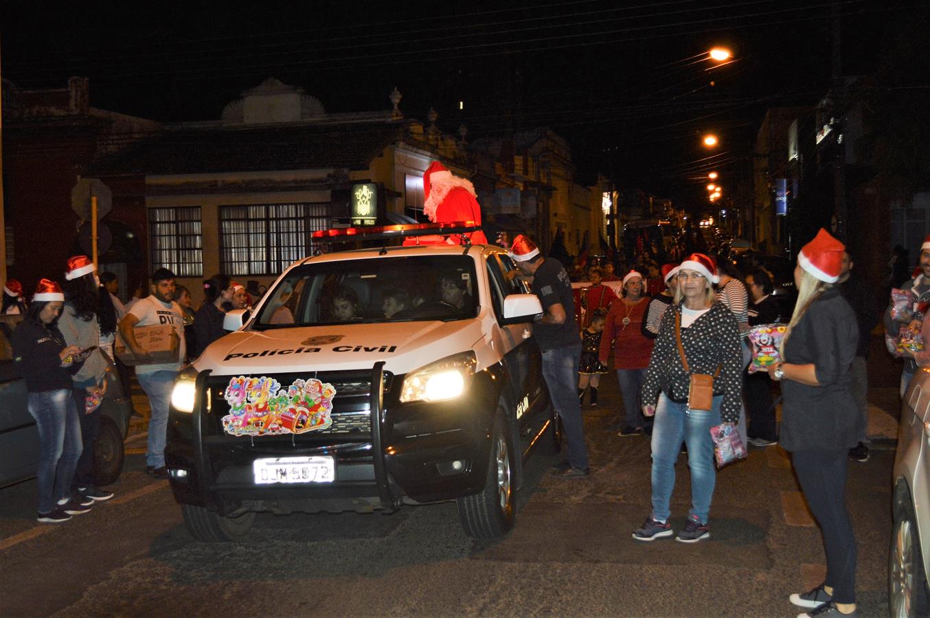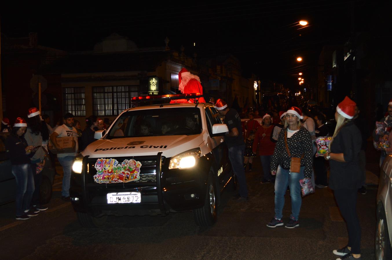 Conduzido na caçamba de uma viatura da Polícia Civil e acompanhado por integrantes da corporação e seus familiares, a atração da noite, o bom velhinho Papai Noel, distribuiu balas e sorrisos para o público. Ele também atendeu a vários pedidos para tirar fotos e cativou crianças e adultos.