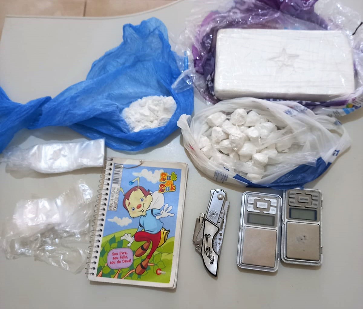 Foram apreendidos também um celular e equipamentos utilizados para o preparo da droga, tais como balanças de precisão e saquinhos de plástico. Um caderno com anotações alusivas à contabilidade do tráfico também foi retido.