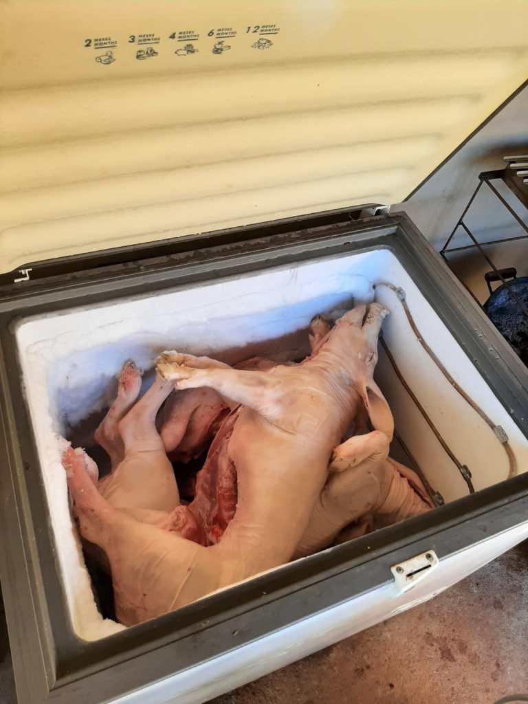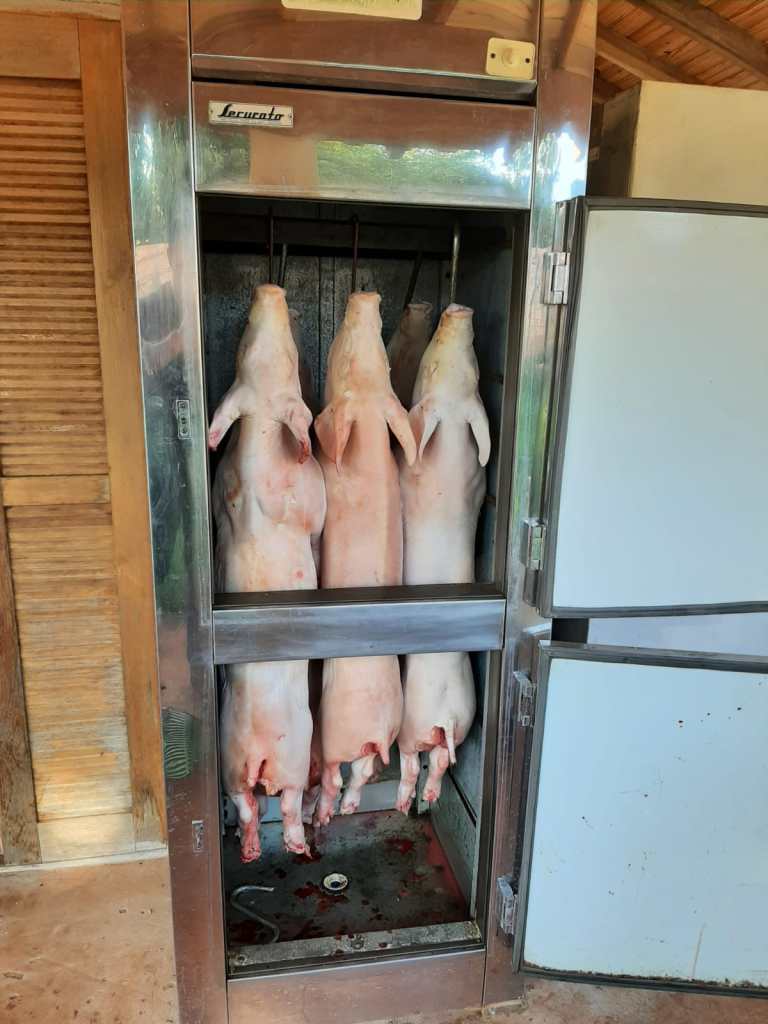 Já no bairro Pinheirinho, os policiais localizaram uma chácara utilizada para o abate e armazenamento clandestino de carne suína. Dois homens, de 48 e 35 anos, foram detidos por venderem carne sem inspeção sanitária, prática enquadrada no artigo 7º, inciso IX, da Lei 8.137/1990, que define os crimes contra a ordem tributária. A Polícia apreendeu facas, balanças e embalagens utilizadas no comércio irregular.