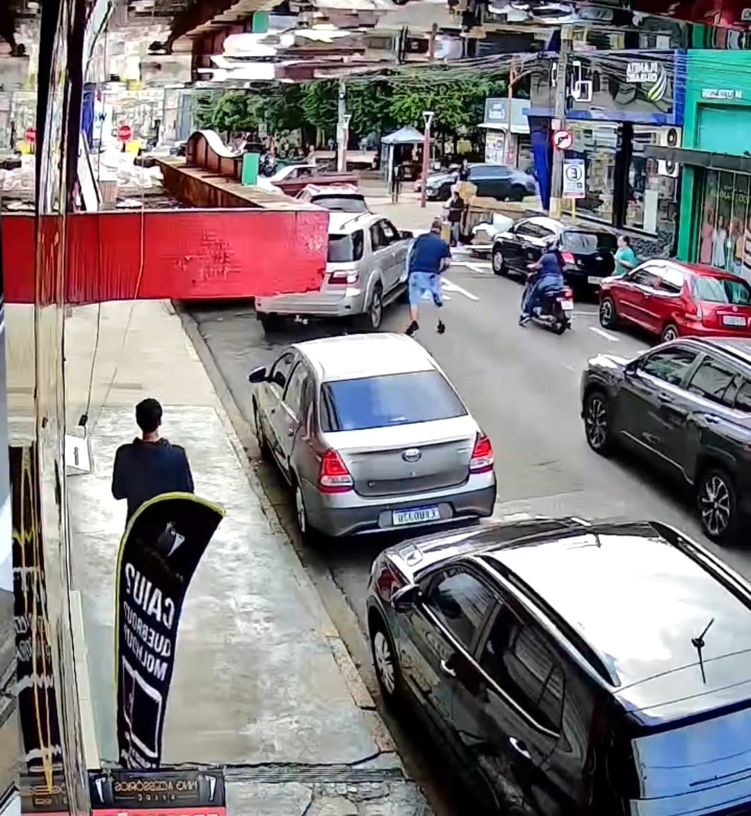 Durante a tentativa de se evadir, o suspeito colidiu com dois outros veículos. A passageira, percebendo o risco iminente, conseguiu saltar do carro em movimento, evitando maiores danos à sua integridade física. O autor, contudo, prosseguiu com a fuga, tomando rumo ignorado.