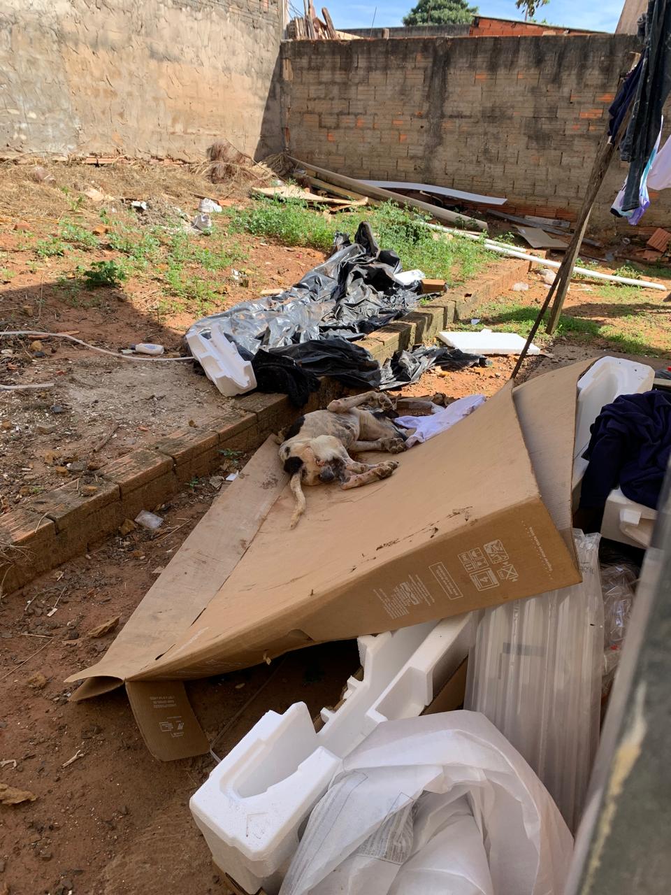 No quintal, nos fundos da residência, encontraram o cão deitado em um ambiente insalubre, sem abrigo, exposto às intempéries, sem acesso a água ou alimentação. O animal apresentava sinais de extrema fraqueza, incapacidade de se manter em pé e múltiplas feridas espalhadas pelo corpo.