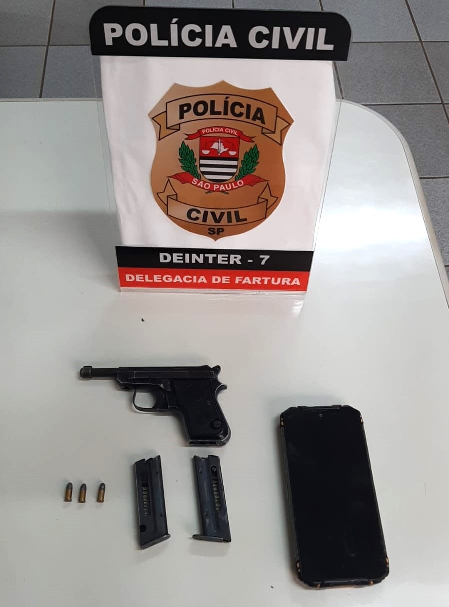 Além da arma e das munições, um telefone celular também foi recolhido. Todo o material foi embalado e lacrado, seguindo os protocolos de segurança.