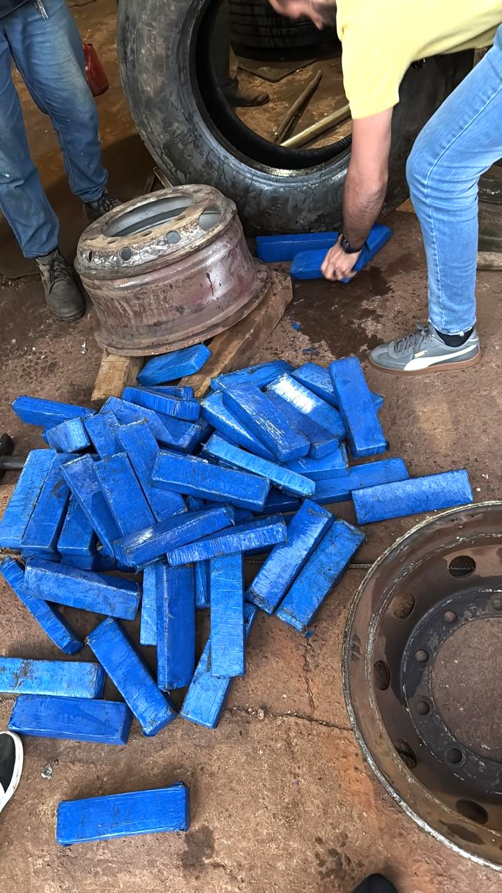 Também foram apreendidos pneus e rodas desmontados, utilizados como compartimento para ocultação da droga, todos devidamente recolhidos e periciados. A investigação apontou a participação de intermediários que contrataram transporte e fretes para viabilizar a entrega da carga ilícita.
